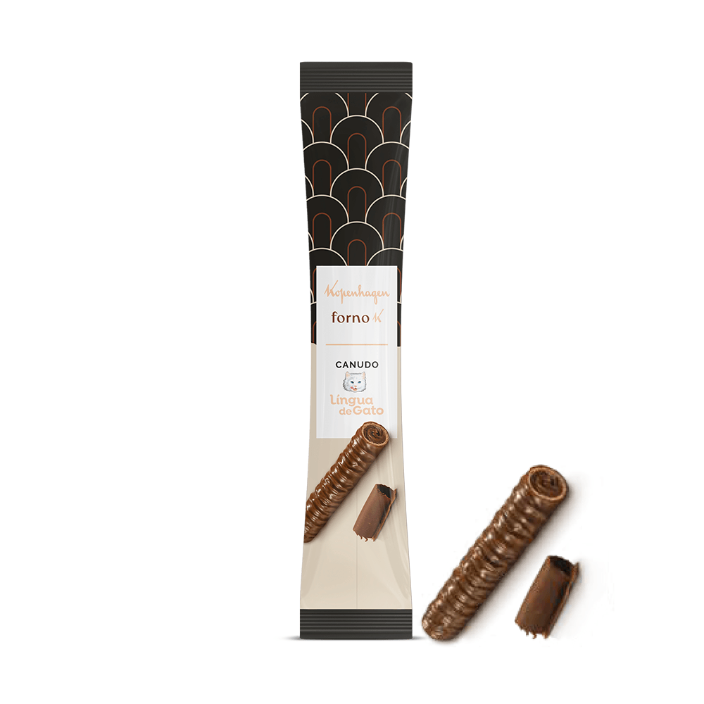 Canudo com recheio língua de gato com cobertura de chocolate ao leite. Perfeito como acompanhamento de café ou saborear a qualquer hora. Experimente.