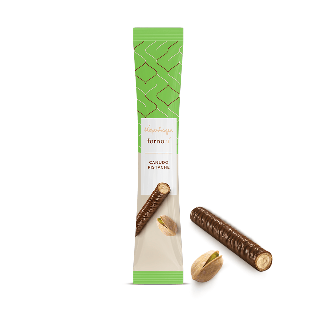 Canudo de wafer recheado com pistache, coberto com chocolate ao leite. Perfeito como acompanhamento de café ou saborear a qualquer hora. Experimente.