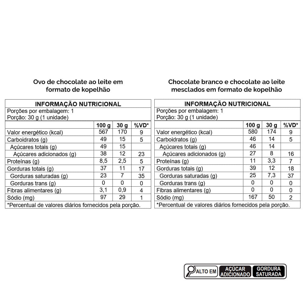Contém: 1 Chocolate ao leite em formato de kopelhão e 1 Chocolate branco e chocolate ao leite mesclados em formato de kopelhão.