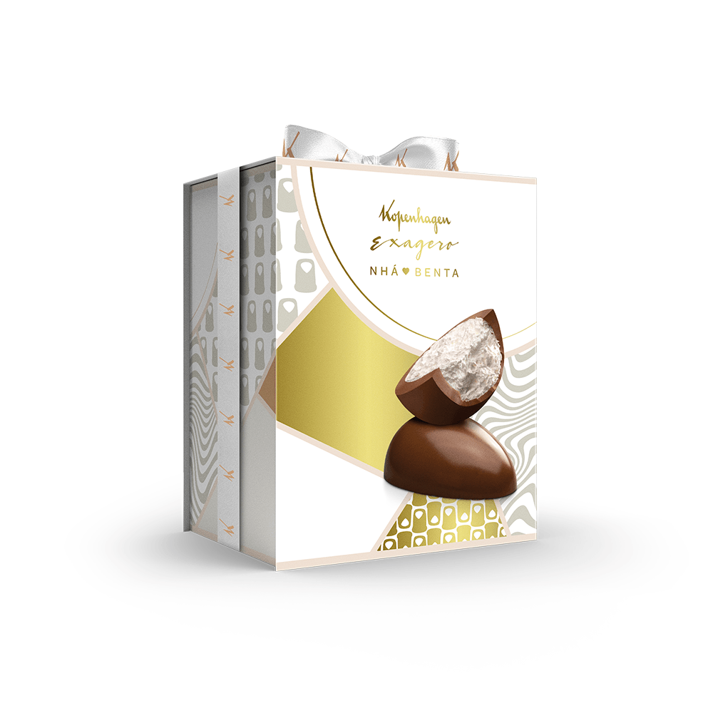 Nosso delicioso e querido Exagero Nhá Benta. Este ovo é uma celebração da combinação clássica e amada de chocolate ao leite com o irresistível recheio de marshmallow. Ovo de chocolate ao leite com recheio de marshmallow. Ovos da categoria Exagero tem mais recheio que os ovos tradicionais e oferecem uma experiência ainda mais indulgente.