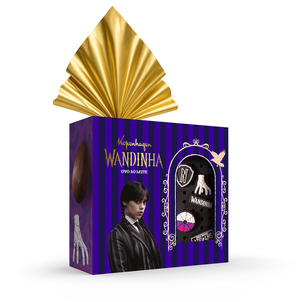 O universo de Wandinha chega à Páscoa com o clássico chocolate ao leite Kopenhagen. O ovo acompanha uma bolsinha exclusiva e muito fofa, além de 5 pins colecionáveis, perfeitos para personalizar mochilas, roupas ou acessórios. Um presente criativo e cheio de estilo, ideal para fãs da personagem e para tornar a Páscoa ainda mais divertida e única.
