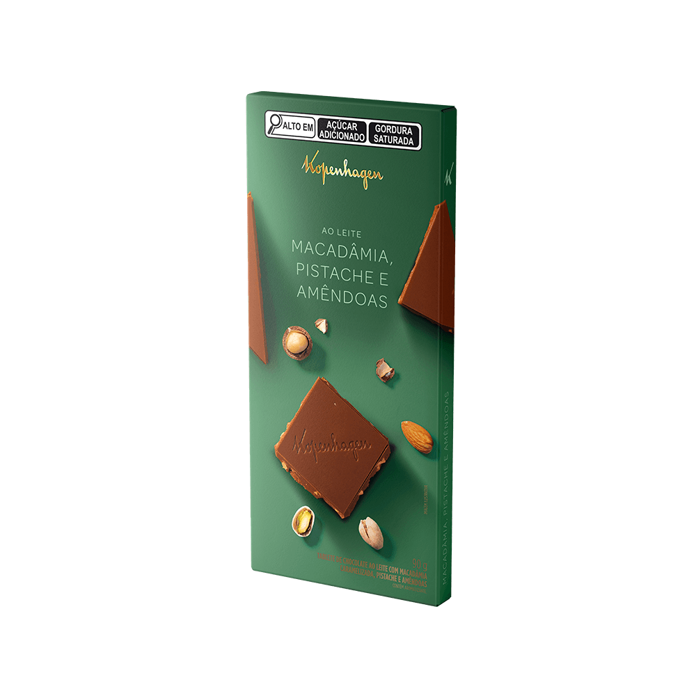 Chocolate ao leite maciço com macadâmia, pistache e amêndoas.